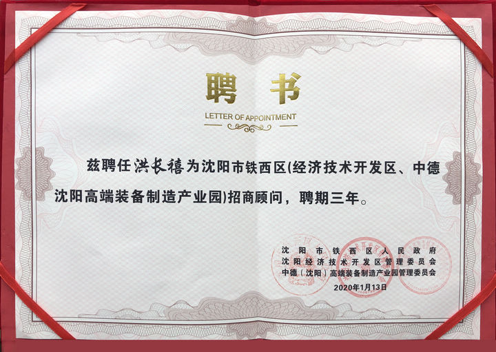 日前,我公司洪長(zhǎng)禧總經(jīng)理被聘任為沈陽市鐵西區(qū)(經(jīng)濟(jì)技術(shù)開發(fā)區(qū)、中德沈陽高端裝備制造產(chǎn)業(yè)園)招商顧問。自從入駐沈陽以來,不忘初心、不辱使命,勇于創(chuàng)新,多年來為經(jīng)濟(jì)技術(shù)開發(fā)區(qū)、鐵西經(jīng)濟(jì)社會(huì)實(shí)現(xiàn)高質(zhì)量發(fā)展,為鐵西區(qū)老工業(yè)基地全面振興做出了應(yīng)有的貢獻(xiàn)!尤其是積極參與謀劃中德沈陽高端裝備制造產(chǎn)業(yè)園的發(fā)展,并成為入駐園區(qū)龍頭企業(yè)。相信隨著產(chǎn)業(yè)園的蓬勃發(fā)展,我公司會(huì)如虎添翼,更上一層樓!