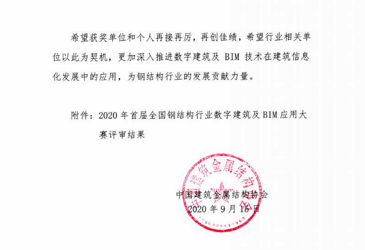 本次大賽由中國建筑金屬結構協(xié)會鋼結構分會承辦,旨在推進數字建筑及BIM技術在建筑信息化發(fā)展中的應用,深化BIM技術在鋼結構工程中的實踐,創(chuàng)新BIM專業(yè)技術人才培養(yǎng)機制。大賽對于提高我國建筑業(yè)建筑信息模型技術的應用水平,實現真正意義上轉型升級,提升工程質量和效率、降低造價和節(jié)約資源,推動技術創(chuàng)新、質量創(chuàng)優(yōu)和人才隊伍建設有著積極的推進作用。同時相信隨著BIM應用的進一步展開,我公司的裝配式建筑發(fā)展將如虎添翼,我司 BIM團隊會取得更加優(yōu)異的成績!