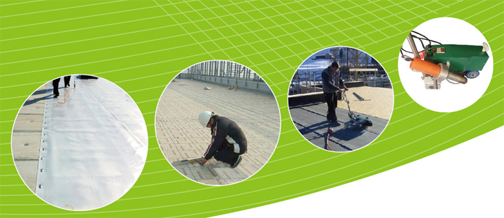 為確保卷材防水層在屋面的整體性,關(guān)鍵之一是搭接處理,通過熱焊接使相鄰卷材搭接形成高于卷材強度的粘結(jié)層,形成卷材整體的連續(xù)密封防水層。 TPO卷材與屋面的固定方式: